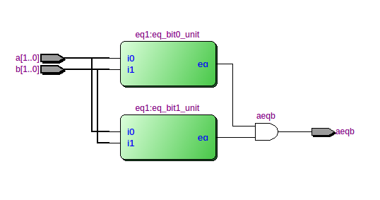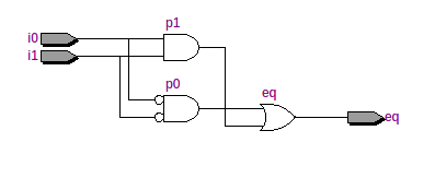 The file list_ch03_01_eq1.v implements a gate-level 1-bit comparator. When compiled, Quartus II compiles the project performing elaboration, systhesis, placement and routing into the FPGA ultimately mimicing how such a circuit would be created using logic-gates. The following ‘netlist’ is synthesized from the code.