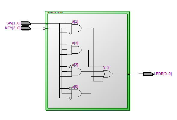The file mux4x1.v descibes a very simple multiplexer circuit where the inputs are provided with the pushbuttons SW0-SW3 and the channel selector are the switches SW0-SW1 in binary. The output is displayed on the the first red LED (LEDR0).
